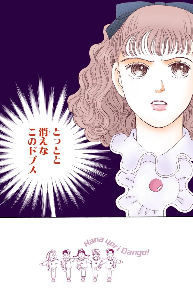 After calling Tsukushi Makino an "ugly bitch," Sakurako Sanjo says "Your days at Eitoku are over" since the F4 and Shizuka Todo are no longer watching out for her. Sakurako then insults Shizuka, which is the final straw for Tsukushi. Now infuriated, she says "Look at yourself in a mirror! Then you'll see what ugly is!" Sakurako replies "You'll beg me for forgiveness [tomorrow]." Tsukushi refuses to back down, declaring "I'll never grovel for anybody!" She then leaves.